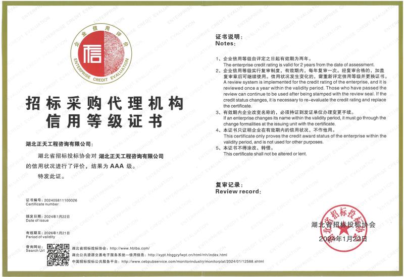 招标采购代理机构信用等级AAA